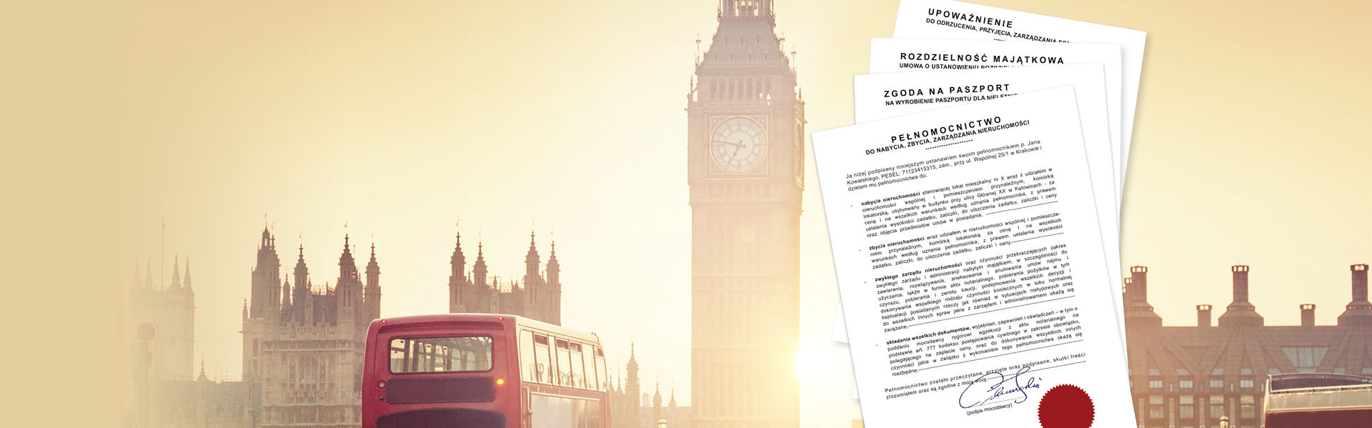 Notariusz w UK – Szybko, Rzetelnie i Niedrogo pomagamy w sporządzeniu różnego rodzaju pełnomocnictw, upoważnień, oświadczeń oraz innych notarialnie poświadczonych dokumentów w UK. Wszystkie nasze dokumenty są sporządzane przez wykwalifikowanych specjalistów praktykujących w Polsce oraz poświadczane przez Notariusza w Anglii, zgodnie z przepisami prawa Polskiego wraz z klauzulą Apostille. Stąd, wszystkie dokumenty przygotowane za naszym pośrednictwem są w 100% akceptowane w Polsce.